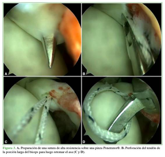 la porción larga del bíceps mediante artroscopia y toma del tendón con sutura