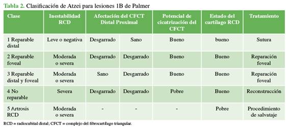 foveal del complejo del fibrocartílago triangular Atzei 2/3 y un seguimiento
