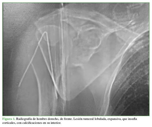 magnética de hombro. Se visualizó una lesión tumoral lobulada, expansiva, que
