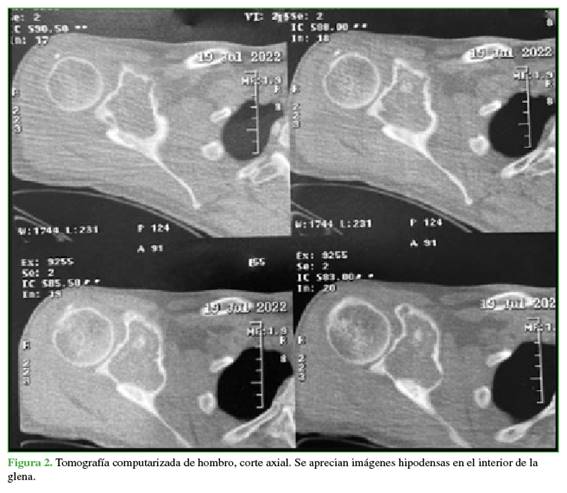 supraespinosa que comprometía los músculos infraespinoso y subescapular (Figura 2).