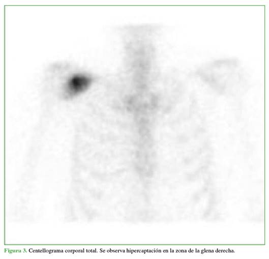 se observó hipercaptación en la zona de la glena derecha (Figura 3), no se apreció metástasis a distancia en