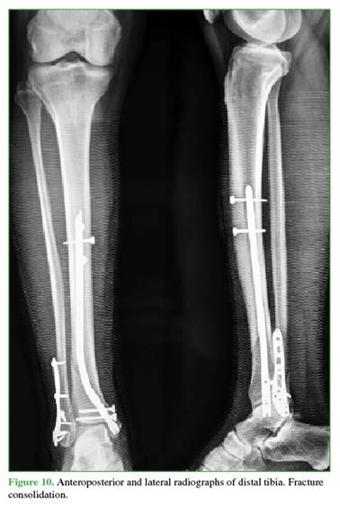 observed in the distal tibia after bone union. According to the AOFAS score, 12