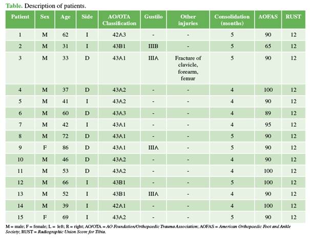 of 51.5 years were treated. Four cases involved open fractures—three classified