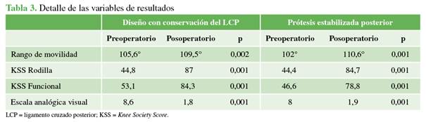 resultados de los diseños de prótesis estabilizada posterior vs. aquellos con