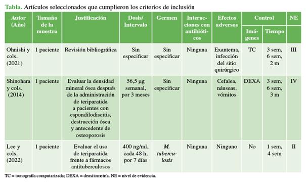 defecto lítico asociado a espondilodiscitis piógena, tuberculosis vertebral. Resultados: En dos artículos, se comunicó la mejoría de la densidad