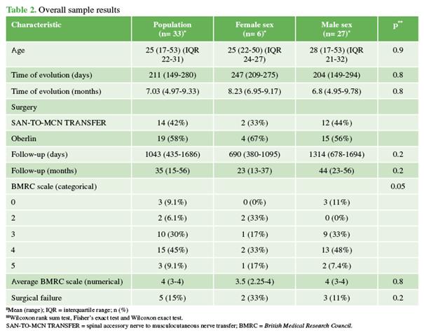 women (4 vs 3.5; p = 0.8), and functional reinnervation defined as BMRC ≥ 3 was