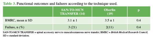 was 3.5; functional reinnervation was achieved in 67%, with a surgical failure