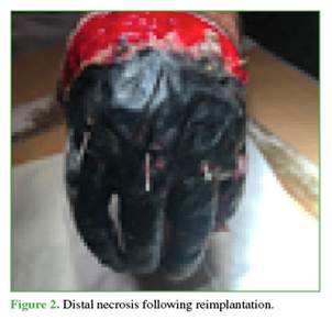 after replantation, cutaneous necrosis of the thumb was detected, prompting