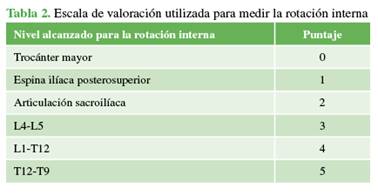 55° y rotación interna de 1,4 a 4 puntos (evaluada con un puntaje de 0 a 5). En