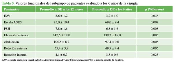 año de seguimiento: EAV de 7,3 a 2,8; ASES de 31,3 a 70,5; Simple Shoulder Test de 3,6 a 7,3; elevación anterior de 70° a