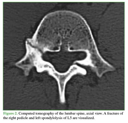 una fractura del pedículo derecho en la 5.a vértebra lumbar y espondilólisis