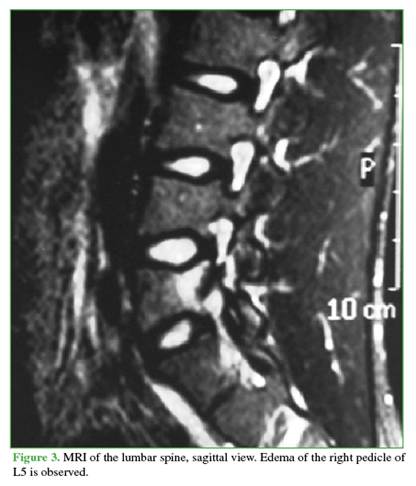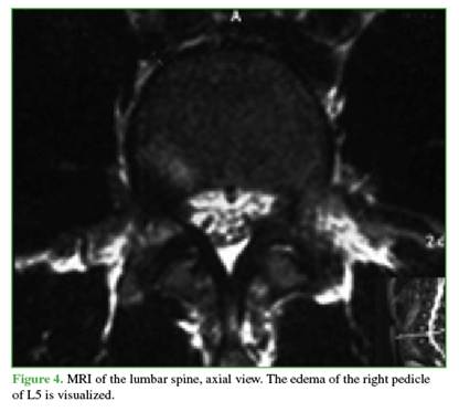Magnetic resonance imaging demonstrated edema in the lumbar pedicle (Figures 3 and 4).