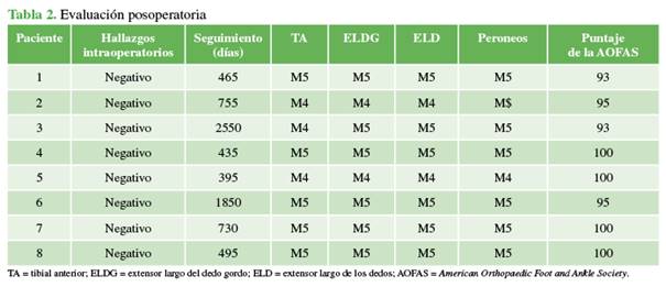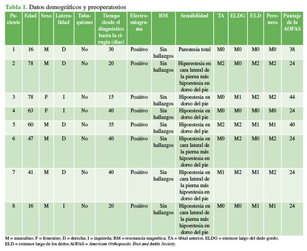 días. Todos recuperaron, al menos, 4/5 de fuerza en dorsiflexión. Seis