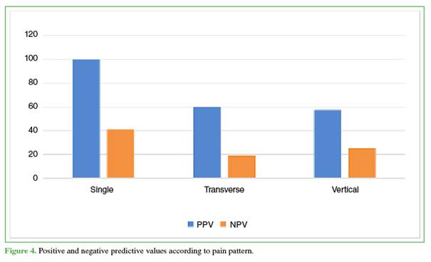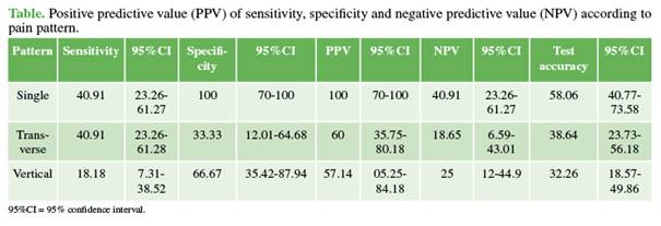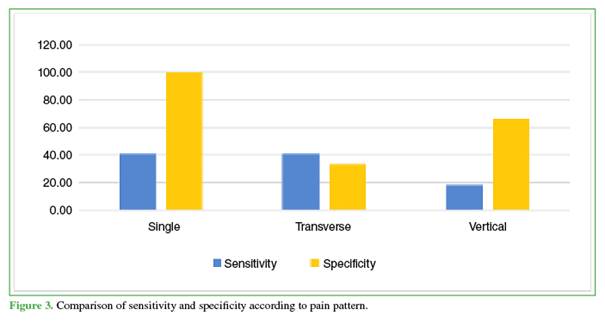 The transverse and focal pain patterns were the most sensitive (40.91%). The