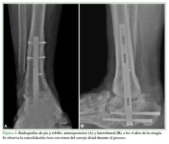 una artrodesis tibio-talo-calcánea con un clavo endomedular retrógrado. Se