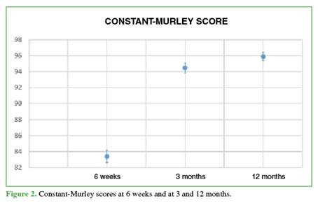 occurred by 6 weeks. The Constant–Murley score improved from 83.35 at 6 weeks