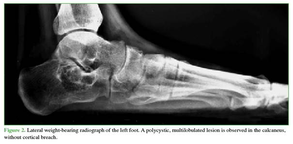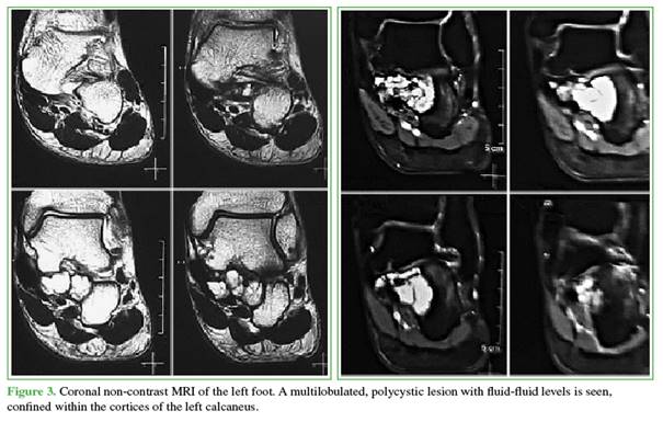 polycystic lesion confined within the cortices of the left calcaneus (Figure 2). Non-contrast MRI showed an expansile, eccentric lesion with well-defined margins, multilobulated morphology, and internal fluid-fluid levels,