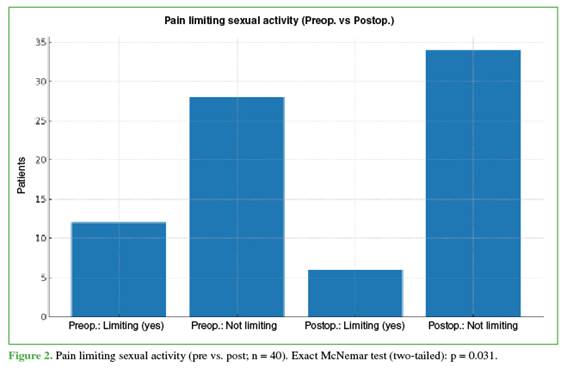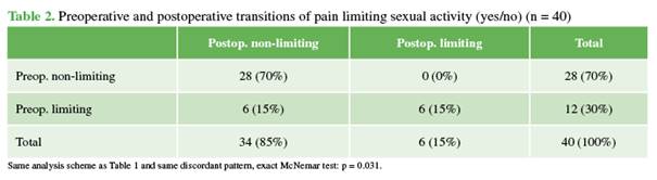 pain that limited sexual activity decreased from 12 (30%) to 6 (15%) (p =
