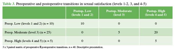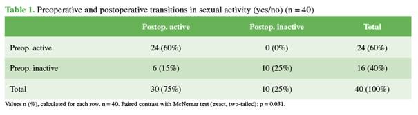 0.031). Among the 30 patients who were sexually active postoperatively, 13.3%