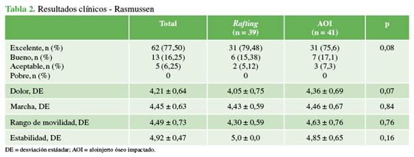 tenía 80 pacientes, 39 tratados con técnica de rafting y 41, con injerto óseo impactado. Dos pacientes del grupo