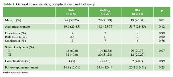 tenía 80 pacientes, 39 tratados con técnica de rafting y 41, con injerto óseo impactado. Dos pacientes del grupo