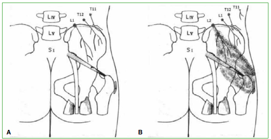 Figura 1. A. Variación de nervios cluneales y relaciones anatómicas. B. Zona sombreada que muestra la región donde