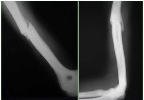 Figura 1. Radiografías de diáfisis del húmero derecho obtenidas el día del traumatismo. Se observa una fractura transversal.