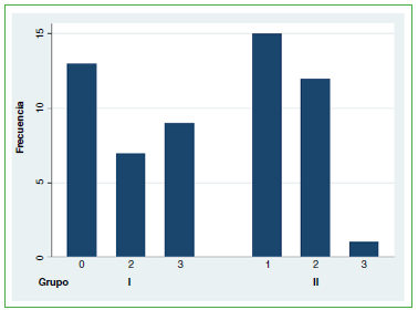 en 14 de los 29 casos del grupo I y en 19 de los 28 casos del grupo II.