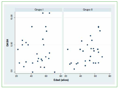Figura 2. Diagrama de dispersión del puntaje DASH respecto a la edad de los pacientes.