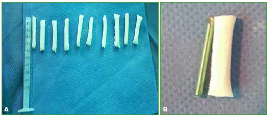 Figura 1. A. Preparación de los espaciadores de cemento utilizando jeringas de tuberculina. B. Clavo de titanio y cemento.