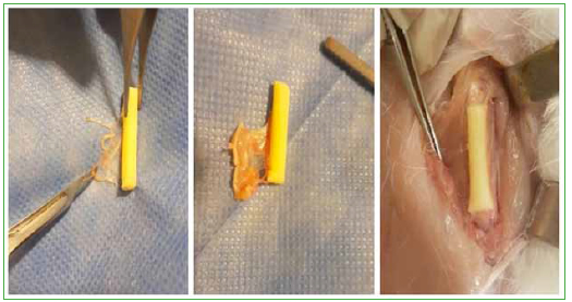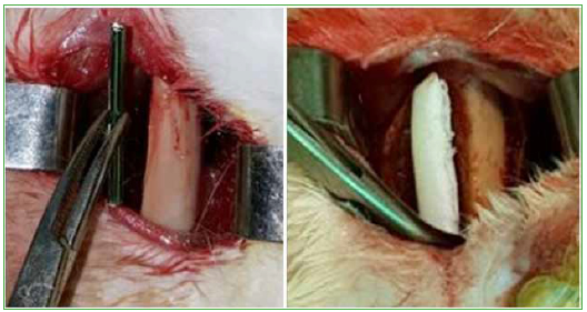 periostio. En el grupo 1, se colocó una prótesis de titanio (fragmento de clavo TEN de 2,0 mm) de 4 cm de largo, en