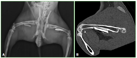 en el fémur derecho (Figuras 1 y 2). En el grupo 2, se colocó una prótesis de acero (fragmento de clavija de acero)