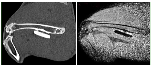 A las seis semanas, todos los conejos fueron sacrificados y se tomaron radiografías e imágenes por resonancia magnética y tomografía computarizada de ambos fémures (Figuras 3 y 4). Las radiografías y las imágenes por resonancia y tomografía fueron evaluadas por un radiólogo especialista en el sistema musculoesquelético, que midió la formación de puentes óseos e inflamación en los distintos materiales colocados en cada conejo. Las resonancias se efectuaron con un equipo Philips® Achieva 1,5 T; se utilizó una antena de rodilla de 8 canales. Las tomografías se realizaron con un tomógrafo Siemens SOMATOM Sensation multislice de 64 canales. Se determinó la formación de puentes óseos mediante cruces (x = 1/3, xx = 2/3, xxx = 3/3). Al extraer los diferentes materiales se evaluaron: el espesor de la membrana, la adherencia de la membrana al material y la formación ósea alrededor del material; estos tres aspectos fueron clasificados por los autores mediante una escala de 0 a 3 cruces, según su magnitud, donde 0 indica ausente y 3, muy marcada. Las membranas que se formaron alrededor de los implantes y el cemento fueron luego meticulosamente disecadas para no dañarlas, y se conservaron en formalina al 10%.