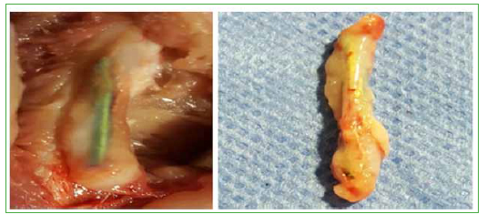 A la sexta semana de colocar los diferentes materiales, se evaluaron 17 conejos; 9 del grupo 1 y 8 del grupo 2 (3 murieron: 1 del grupo 1 y 2 del grupo 2). Al extraer los diferentes materiales se observó macroscópicamente que: la membrana formada alrededor del cemento con antibióticos era significativamente más ancha que las del resto, seguida de la que rodeaba a las clavijas de acero, esta era muy fina en los grupos de cemento con corticoide y clavos de titanio; por el contrario, la membrana mostró mayor adherencia en el grupo de clavos de titanio y de cemento con corticoide. Solo se observó una significativa formación ósea alrededor de los clavos de titanio (Tabla y Figuras 5-8).