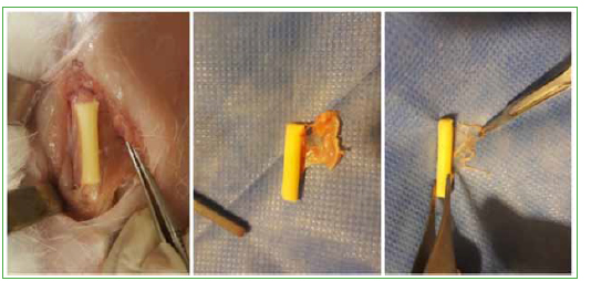 Figura 2. Técnica quirúrgica. Completa elevación del periostio y colocación de los diferentes materiales paralelos al fémur