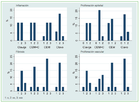 Figura 9. Distribución de las respuestas: inflamación, proliferación epitelial, fibrosis y proliferación vascular para los dos