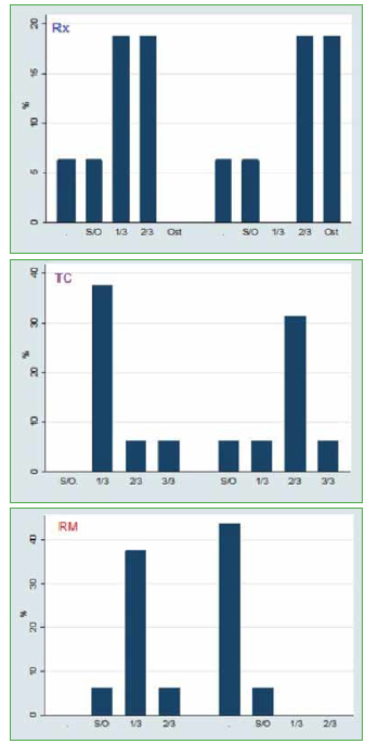No hubo diferencias significativas entre los lados (derecho = cemento más corticoide, izquierdo = clavija) en las radiografías y las imágenes tomográficas (p = 0,310, p = 0,988, respectivamente). Respecto a la resonancia magnética, la mayoría de las respuestas indicaron sin osteointegración o una escala de valoración de hasta 1/3. Se destaca que el 87% de los animales a los que se les colocó clavijas no tuvieron observaciones de osteointegración debido a distorsión de la imagen o pérdida de señal producidas por la característica del material (metal), en tanto que ese mismo porcentaje mostró una respuesta de 1/3 y 2/3 de osteointegración en los animales con cemento más corticoide. Es esta tendencia la que se distinguió significativamente (p = 0,003) entre ambos (Figura 10).