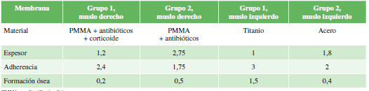 Introducción: El objetivo de este estudio fue analizar y comparar las características de las membranas que se forman alrededor de espaciadores de cemento y aquellas que rodean a implantes de titanio y acero. Materiales y Métodos: Veinte conejos en 2 grupos de 10: grupo 1, espaciador de cemento con antibióticos en fémur derecho y clavo de titanio (TEN) en fémur izquierdo; grupo 2, espaciador de cemento con antibióticos más corticoide en fémur derecho y clavija de acero en fémur izquierdo. A las 6 semanas se extrajeron las membranas. Se evaluaron sus características macroscópicas, bioquímicas, histológicas y en las imágenes. Resultados: Macroscopia: la membrana del cemento con antibióticos era significativamente más ancha y, en el cemento con corticoide y el TEN, era muy fina y adherente. Microscopia: menos inflamación en el cemento con corticoide (p = 0,0502), sin diferencias con las clavijas (p = 0,322). La proliferación epitelial era mayor en las clavijas (p = 0,026) y escasa en el cemento con corticoide (p = 0,071). Hubo una leve tendencia a la proliferación vascular (p = 0,107), de menor actividad, en el grupo con corticoide vs. sin corticoide. No hubo diferencias entre clavija y TEN (p = 0,737). No hubo diferencias significativas en las radiografías y la tomografía (p = 0,988). En la resonancia magnética, la mayoría de las respuestas en el grupo 2 indicaron sin osteointegración, debido a distorsión de la imagen (metal). Conclusiones: Diferentes materiales y los diferentes agregados alteran macroscópica e histológicamente las membranas. El cemento con corticoide presentó menor inflamación y fibrosis, menos proliferación vascular, y membranas más finas y adherentes.