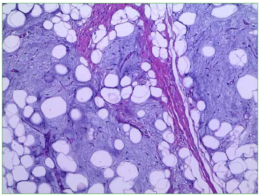 abundante estroma mixoide separado por prominentes tabiques fibrosos de lobulos de adipocitos en varios estadios de