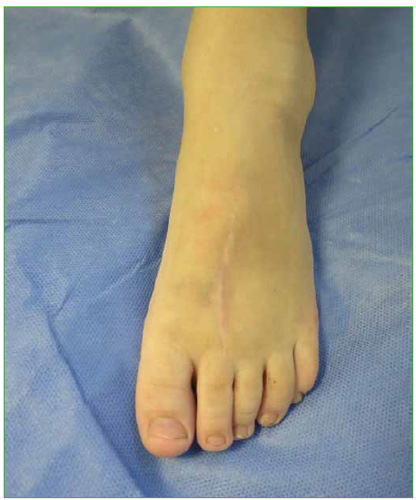Se decidio realizar una biopsia escisional mediante un abordaje dorsal del pie (Figura 3). No hubo complicaciones durante la cirugia ni en el posoperatorio.