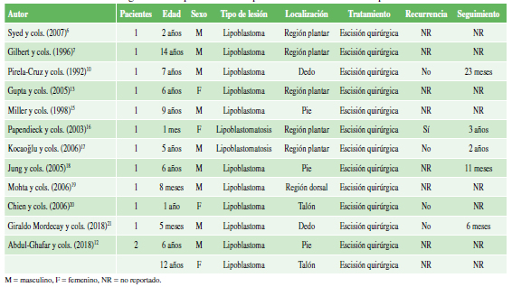 Tabla. Revisión de la bibliografia sobre pacientes con lipoblastoma localizado en el pie