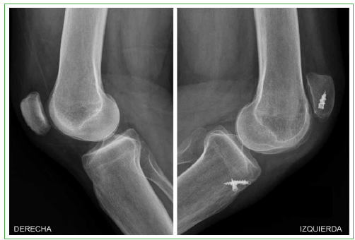 Figura 2. Radiografías de rodilla, de perfil, comparativas. Se observa el ascenso de la rótula en la rodilla