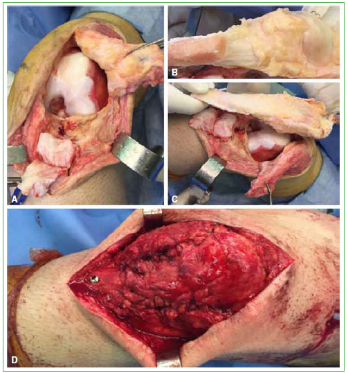 Se realizó la reconstrucción del aparato extensor mediante un trasplante óseo masivo. Utilizando el abordaje anterior