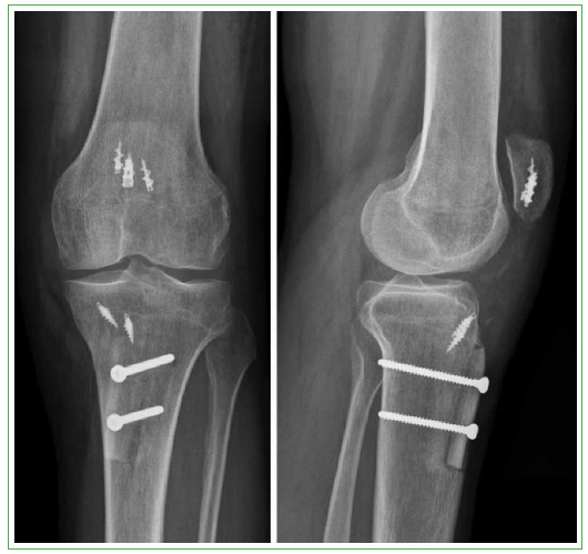 Figura 5. Radiografías de rodilla, de frente y de perfil, tras la reconstrucción con aloinjerto de aparato extensor.