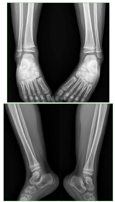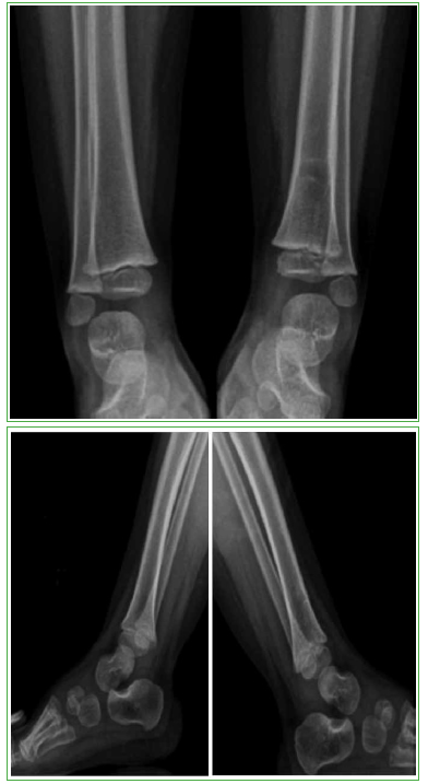 Figura 5. Radiografías de frente y de perfil, de ambos tobillos, a los 2 años y 6 meses de la