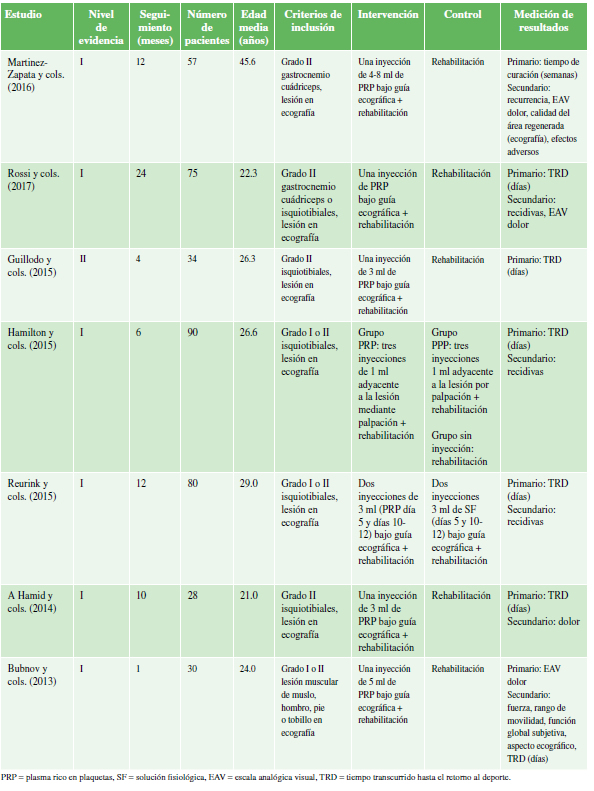 el objetivo de esta revisión fue evaluar los resultados publicados sobre el PRP para lesiones musculares agudas.