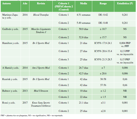 sobre el tiempo hasta el retorno al deporte tras la terapia con PRP. El metanálisis demostró una diferencia significativa