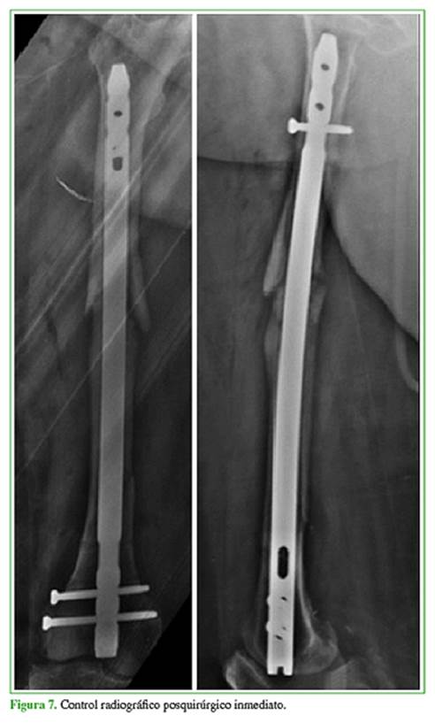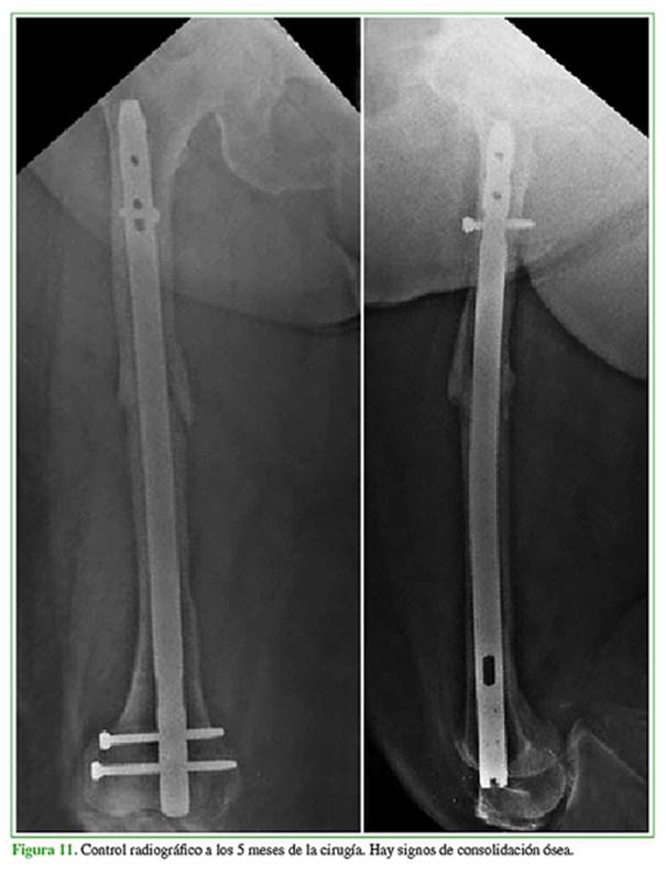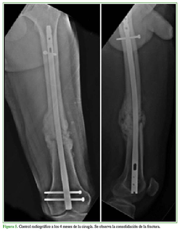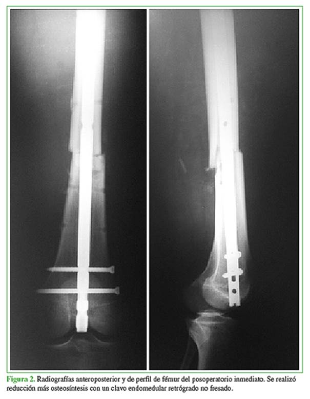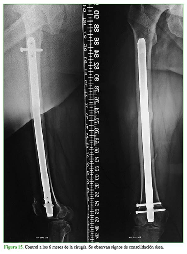 yeso. Al octavo día se realizó la conversión del tutor externo a clavo endomedular retrógrado de fémur de 9 mm x 350 mm no fresado