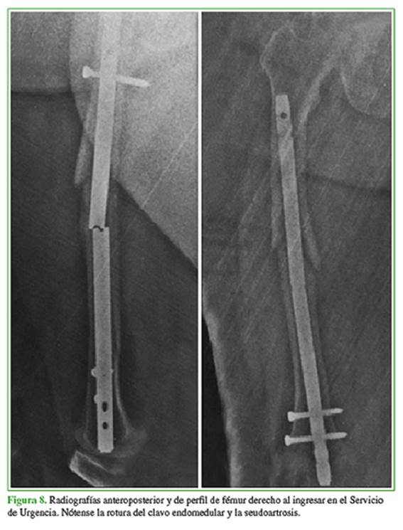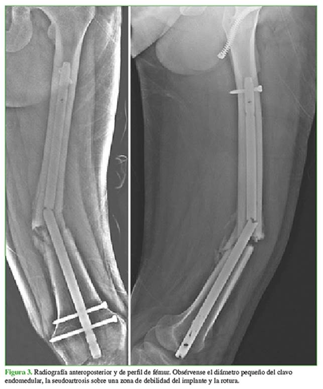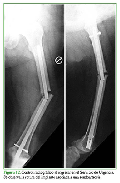 sin un traumatismo previo. En el control radiográfico, se observó la seudoartrosis y la rotura del implante. Se identificaron