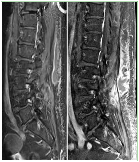 Figura 1. Resonancia magnética de columna lumbar, corte sagital. Se observa una colección en relación con la